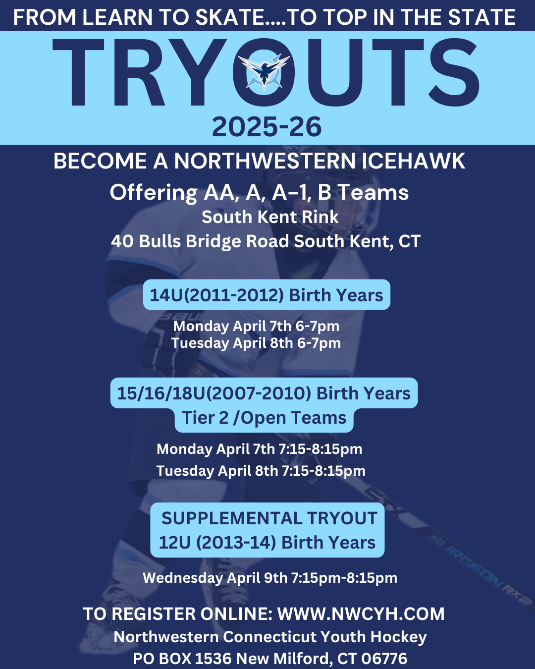 For the 2025/26 season, the Northwest Icehawks plan to field competitive travel teams at all age levels (Mites, Squirts, Peewees, and Bantams). In addition, short season Midget (high school) teams will be formed. The exact number of teams at each age level will be determined by the number of players interested in joining a travel team. When multiple teams are formed at an age level, they are organized by skill level (i.e., AA, A, A-1 B, etc.) as determined by the tryout process.